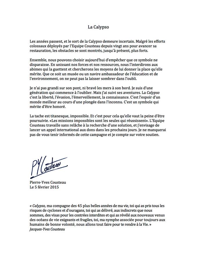 du message de Pierre-Yves Cousteau sur Facebook, recopié et transmis par