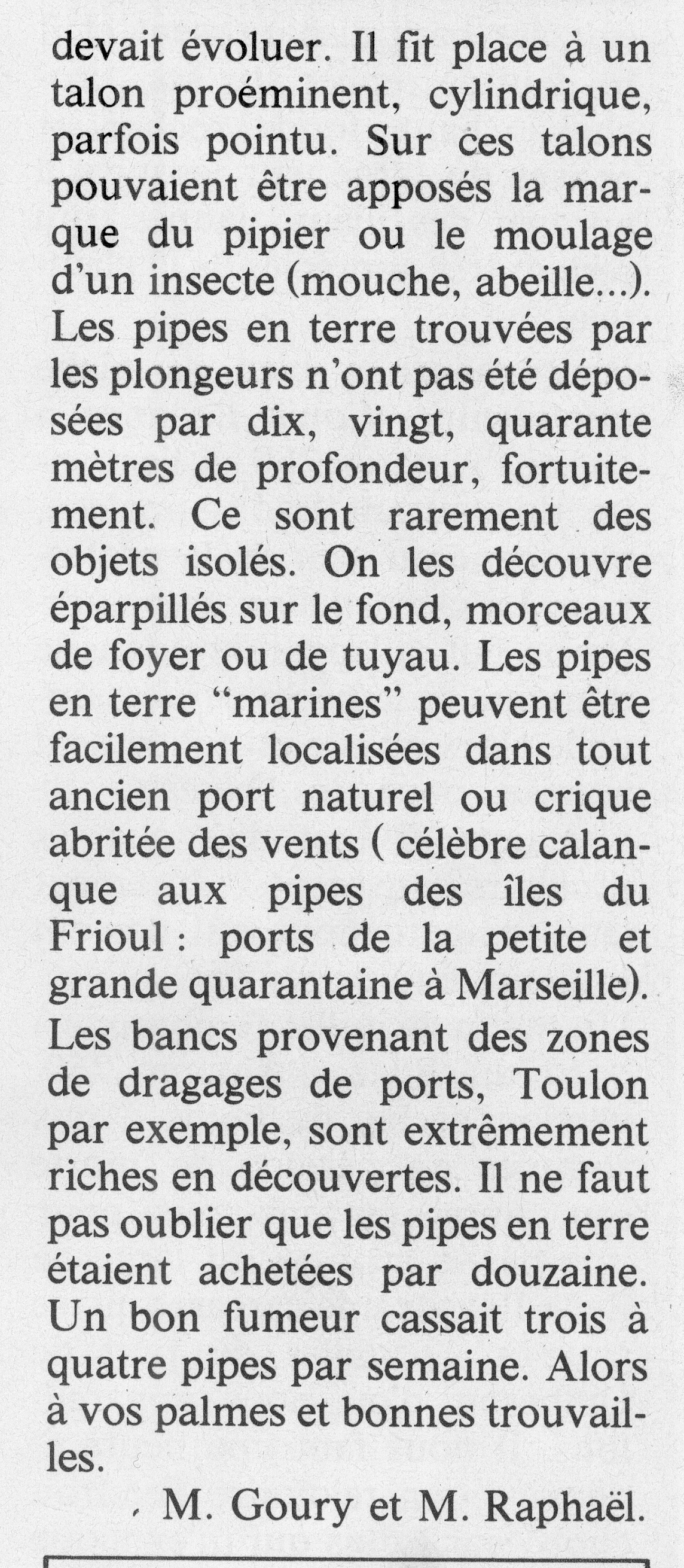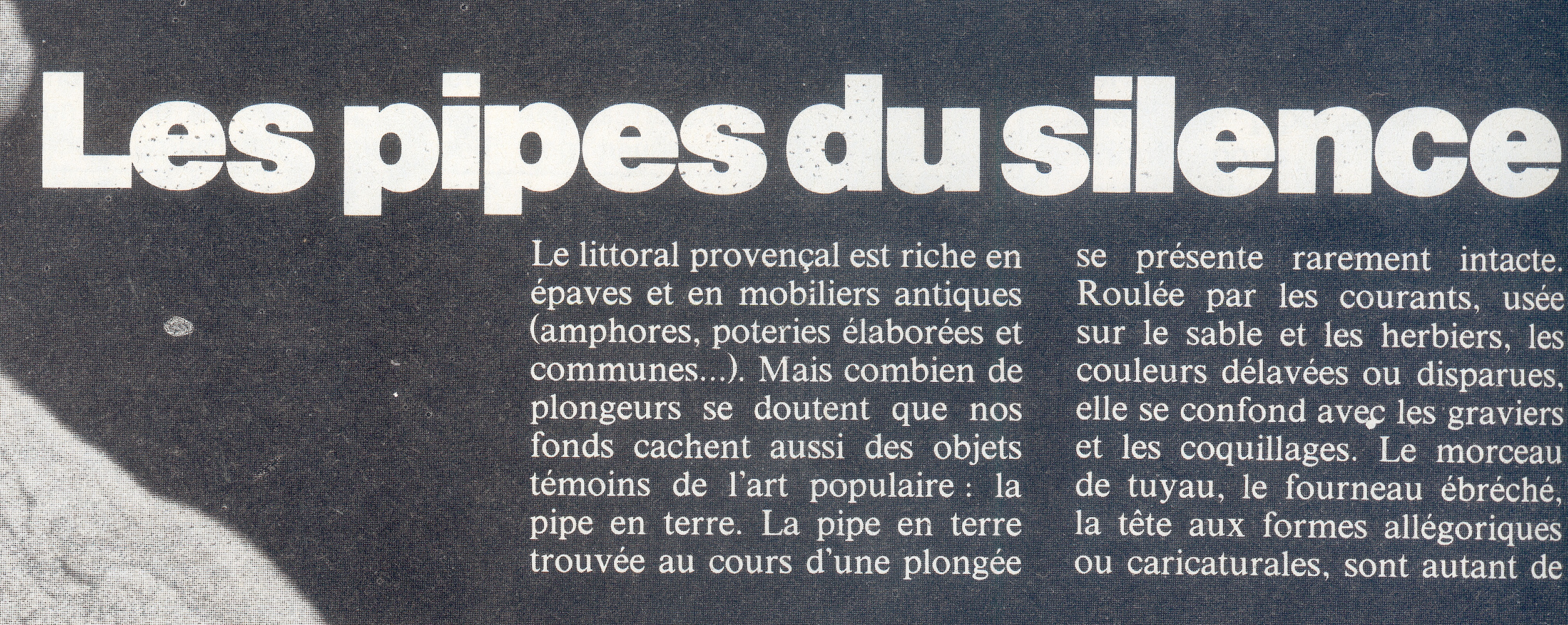 Maurice Raphaël un personnage! for goodness’sake!Nous avons souhaité parler davantage de Maurice Raphaël dont le dernier livre est disponible à la librairie du musée (rubrique « boutique ») et bien sûr dans le fonds documentaire. Et pour celà Serge Malcor (plongeur, archéologue, subtil écrivain, président fondateur du Jonquet Kayak Club de La Seyne) a bien voulu raconter la vie d’un personnage attachant, un chercheur infatiguable, un poëte: « Emile Maurice RAPHAEL, dit Momo. Né le 1ermai 1940 à Paris, Émile fut recueilli par l’Assistance publique puis vers l’âge de quatorze ans décida de s’engager dans la marine marchande. Il réalisa ainsi de nombreux voyages dans la plupart des grands ports d’Asie et d’Afrique. Après son service militaire, dans la marine, à Toulon, il réussit à intégrer le personnel de l’arsenal par la petite porte. Dans un premier temps il effectua des travaux subalternes aux bassins avant de devenir scaphandrier (pieds lourds) dans ces mêmes bassins. Il sauta sur l’occasion quand se présenta à lui l’opportunité de suivre une formation de plongeur démineur pour la pyrotechnie. C’est ainsi qu’il fut embarqué sur la Vive (la vedette des plongeurs de la Pyrotechnie qui avec le Mérou officiait en Méditerranée). Entre temps il s’était marié avec Fortunée (Néné) Di Tomaso qui lui fit trois enfants : Serge, Magali et Philippe. En 1975, il fait la connaissance des plongeurs du JKC (Jonquet Kayak Club) et entame son initiation à l’archéologie sous-marine. Rapidement passionné par le banc de dragage du port de Toulon qui au large du cap Cepet réceptionna des milliers de tonnes de vase et de vestiges du passé, il y commence une récolte de pipes en terre (improprement nommées pipes de bagnards). Parallèlement, avec les autres membres du JKC, il débute une formation archéologique auprès de François Carrazé afin de pouvoir dater plus précisément les diverses trouvailles remontées au cours des prospections réalisées par le club dans les années 80, alors qu’une perfide arthrose le pousse inéluctablement vers une retraite anticipée, il travaille sur des chantiers de fouilles sous marines à Pomègues (Michel Goury), à Villefranche (Max Guéroult) tout en écumant les bibliothèques et les archives navales. Maurice Raphaël lors d’un stage de formation de plongeurs aux techniques de fouilles. Stage organisé et conduit par François Carrazé. C’est en 1977 à Gillières. A la fin du stage Maurice Raphaël participa aux fouilles de l’épave romaine dite « du Langoustier ». Photo transmise par François Carrazé. En 1984, il obtient une autorisation de fouille sur une épave située en baie de Cavalas, par 42/43m et avec l’aide du Jonquet Kayak Club l’étudie durant cinq ans. Il servira également de suppléant aux travaux de Serge Malcor puis d’André Farrugia sur l’épave des médailles, au large du Grand Rouveau (Le Brusc) par 34/36m. Ce personnage haut en couleur, écrivain et poète à ses heures, passionné par les pipes en terre était aussi une figure de l’archéologie sous marine fédérale en méditerranée. l était titulaire du brevet fédéral d’initiateur en archéologie subaquatique et obtint la médaille d’or de la FFESSM pour l’organisation de nombreux stages en archéologie et le montage de plusieurs expositions. Certes, la pédagogie n’était pas son fortet ses éclats de voix étaient là pour nous le rappeler mais tel était le personnage et quand on avait la chance de le connaître depuis longtemps on s’apercevait que tout cela n’était qu’une façade derrière laquelle se cachait un cœur gros comme ça. Parallèlement à ces activités, il peaufina ses connaissances sur les pipes en terre au point d’acquérir un savoir sur ce sujet qui l’amena à se déplacer aussi bien en France qu’en Belgique, Pays Bas et même à Saint Pierre & Miquelon pour des recherches ou des conférences. Il se constitua une impressionnante collection de pipes en terre qui fut très souvent appréciée dans les expositions internationales. Il édita à ce propos deux ouvrages qui firent date sur la fabrication des pipes en terre en Europe, les divers modèles répertoriés dans chaque fabrique et enfin les fabriques de pipes de la région marseillaise: « La pipes en terre, son périple à travers la France » (1991) « La pipe en terre à Marseille»(2003). voir notre rubrique Boutique du musée. « LES PIPES DU SILENCE » Article signé Michel Goury et Maurice Raphaël. OCEANS N°79 de SEPT 1979. Fonds documentaire du musée Frédéric-Dumas. Don Patrick Ponot. SUITE DE L’ARTICLE SUITE DE L’ARTICLE (2) FIN DE L’ARTICLE « Les pipes du silence ». Encadré. biographie suite et fin: Après la dissolution du JKC en 1997, Momo s’orienta vers le club Apnéa où il créera une section d’archéologie sous marine. Il continua d’animer des sessions de formation d’archéologues sous–‐marins et de réaliser des stages in situ pour permettre aux futurs promus d’évoluer dans les conditions d’une vraie fouille. Il disparut brutalement le 15 juillet 2007, victime d’une crise cardiaque, à La Verne (baie des Sablettes), par moins de 50 centimètres d’eau, alors qu’il se préparait à effectuer le baptême de plongée de sa petite fille. Ses camarades et amis lui ont rendu un dernier hommage par la voix de Serge Malcor, président fondateur du Jonquet Kayak Club : « Ciao Momo ! C’était certainement la seule éventualité pour tirer un trait sur notre amitié. Une trentaine d’années semée de plongées, de fouilles, de trouvailles et d’une myriade de bons moments connaît désormais son tragique épilogue. À chacun de nous tu as laissé l’empreinte de ton caractère et nous avons subi la nouvelle de ton départ comme une amputation. Malgré tes jugements parfois sans retour, chacun de nous conservera de toi l’image de ta pugnacité et de
