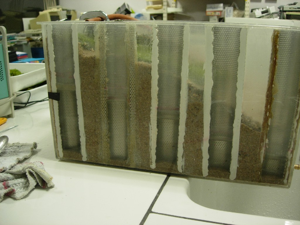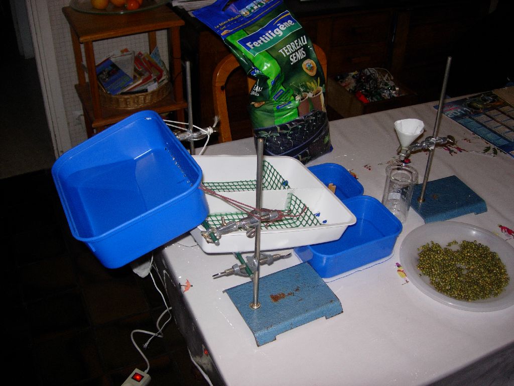 Le bac verseur est percé de trous et est rempli avec un bécher pour quantifier le volume. Il vaudrait mieux aussi le séparer en 2 parties étanches afin que le volume soit le même dans les 2 demi sols expérimentaux. Son inclinaison variable permet de faire varier le débit. Le bac test est inclinable et le sol est retenu au fond pour éviter le glissement de terrain. Un grillage plastique fin retient les particules à l'aval (non visible sur la photo). Les articulations des bacs se font avec un axe métallique tournant dans un tuyau de plastique collé au fond des bacs avec un pistollet à colle.
