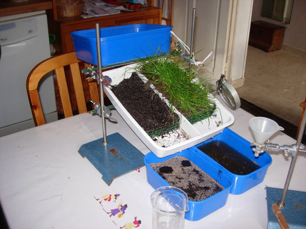 C'est un modèle analogique qui permet de simuler l'érosion d'un sol grâce à un bac inclinable, et une source d'eau identique dans 2 situations. On peut faire varier plusieurs paramètres comme le volume et le débit d’eau, la pente de sol, le couvert végétal, la perméabilité, l'aménagement du sol on peut quantifier la charge de terre érodée, par filtration ou décantation et mener une véritable démarche expérimentale. Il est facile à construire mais nécessite quand même quelques bricolages: