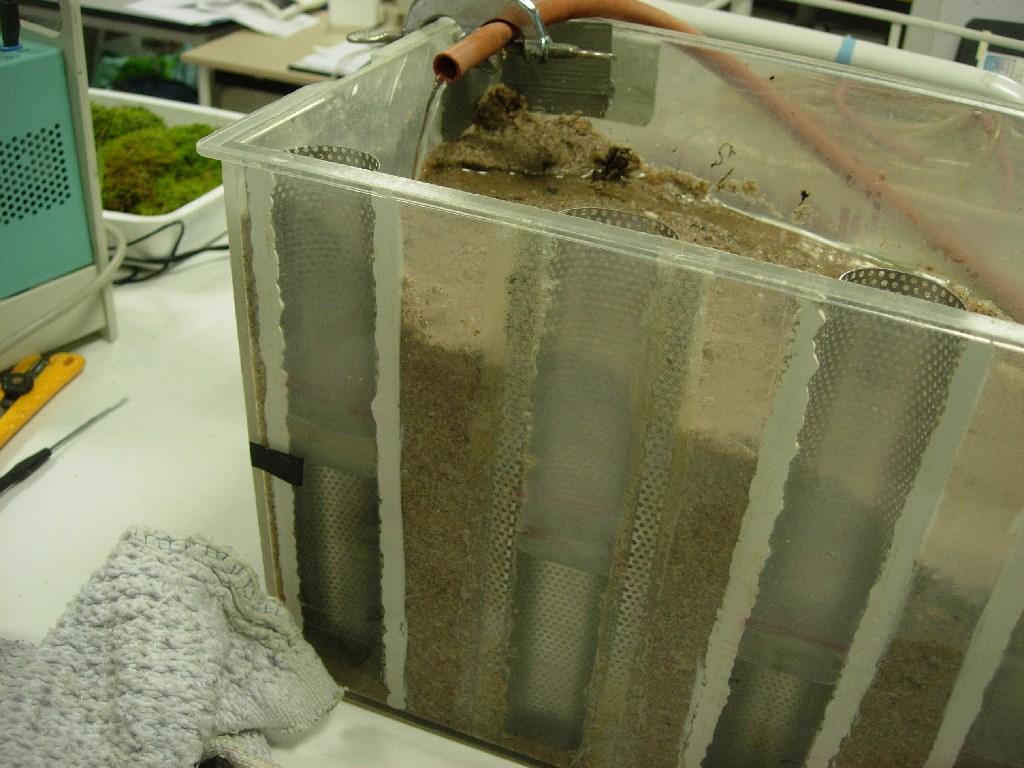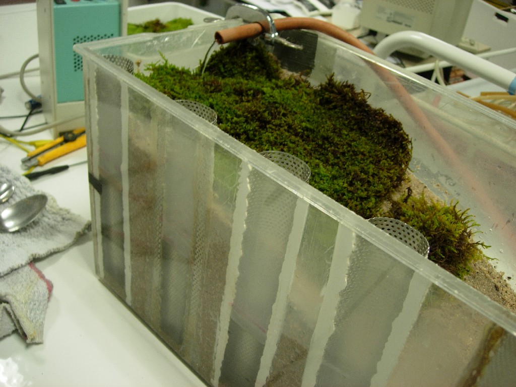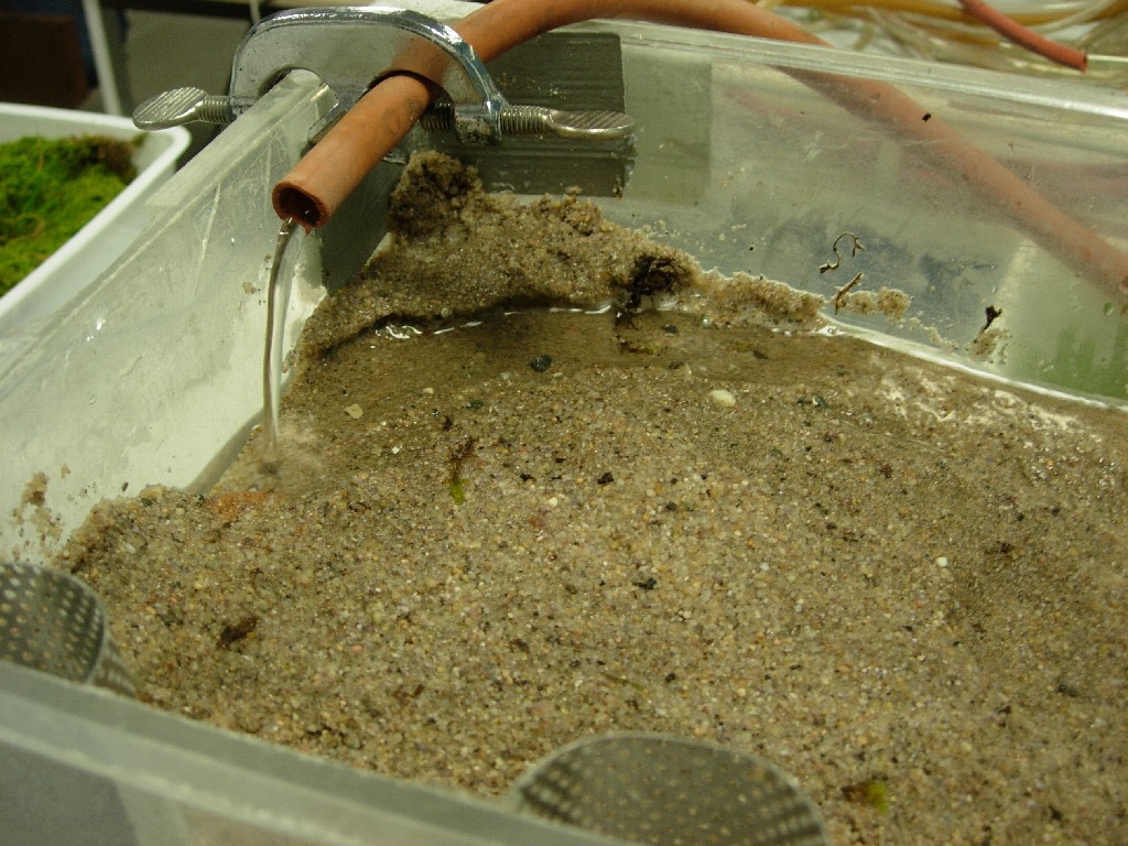 Sans rien changer au débit, on place de la mousse dans la zone de ruissellement, et on attend le nouvel équilibre: on constate que le niveau de la nappe s'élève: à présent les eaux ne ruissellent plus mais s'infiltrent, autant de plus pour la nappe.